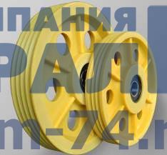 Пластиковый отводной блок У-001.00.146-01 заменяет чугунные ролики, используемые ранее в лифтовых системах. Наружный диаметр изделия 410 миллиметров при весе 11,2 кг. Для размещения каната d 8 мм пропущено по бокам диска семь ручьёв.