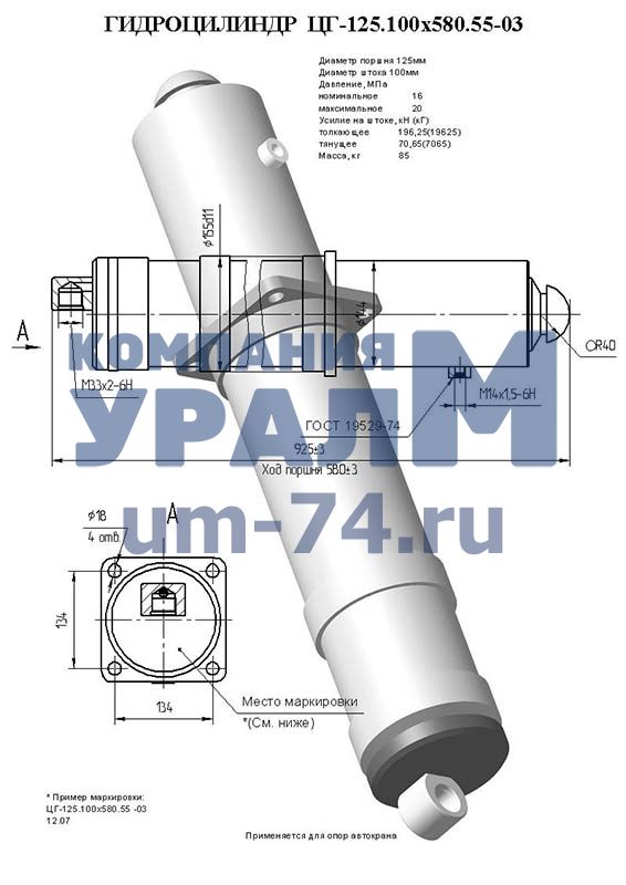 Гидроцилиндр опоры вывешивания автокрана ГЦ-100.125х580.55 (КС-45717.31.200) под ввертной гидрозамок – опорный гидравлический цилиндр двухстороннего действия, используемый в конструкции выносных опор, которые увеличивают расстояние между опорными точками автокрана, повышая при этом его устойчивость.